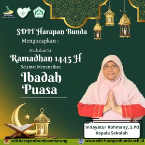 Keluarga Besar Sekolah Dasar Islam Terpadu (SDIT) Harapan Bunda Semarang mengucapkan Marhaban Ya Ramadhan. Selamat menunaikan Ibadah Puasa Ramadhan Tahun 1445 hijriyah. Semoga Puasa dan ibadah selama bulan Ramadhan kita diterima oleh Allah SWT dan menjadi pemberat amal solih di akhirat kelak.